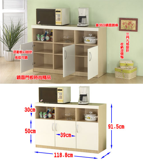 共有一展示櫃、兩門收納、三抽屜、及諸多開放式隔層,收納系統良好,