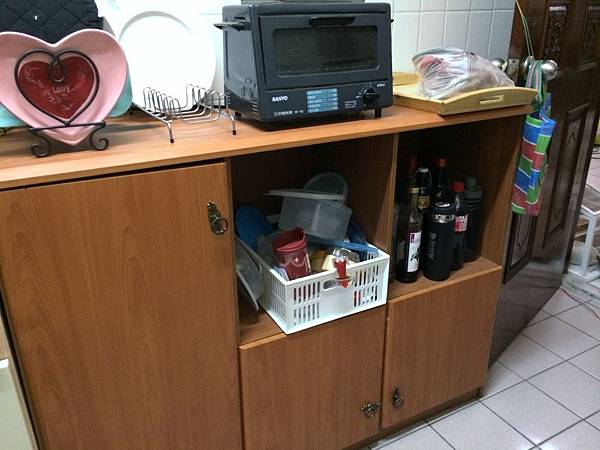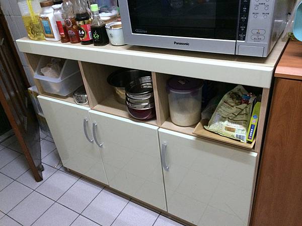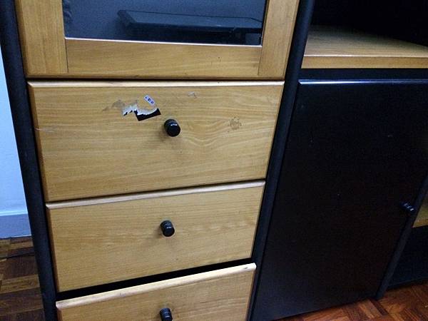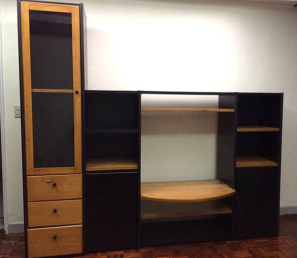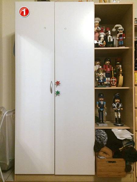 【編號1】 背板因濕氣微凹,不影響使用,最右側的門片未安裝用來當展示櫃,一邊的門把以 IKEA 配件裝飾,7成新,售 $359。 售出
